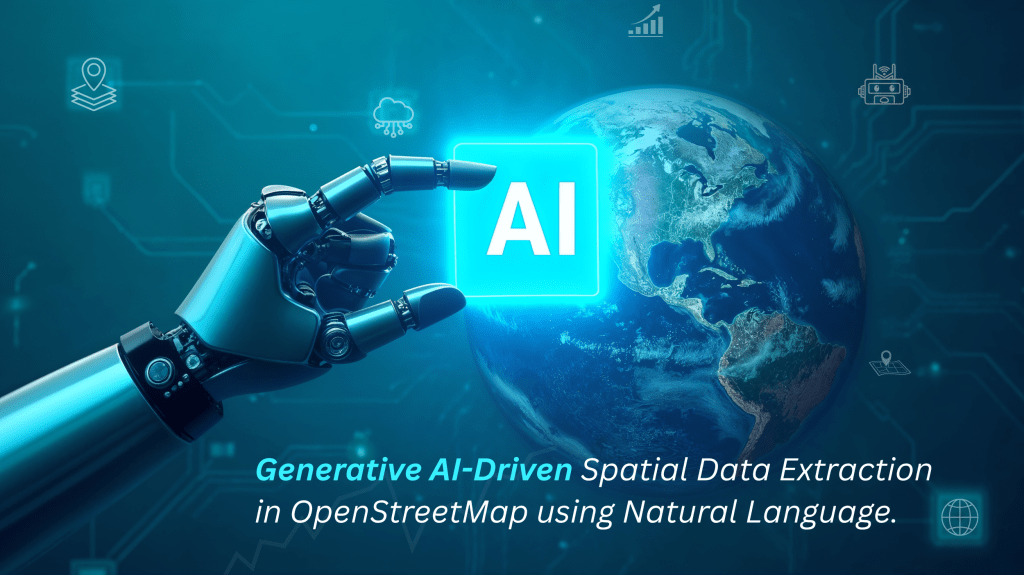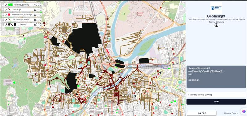 - Web-Enabled Framework: Designed for simplicity, the framework guides users through selecting an Area of Interest (AOI), entering a natural language query, and receiving mapped results. The input is processed and translated by GPT into a structured query compatible with the Overpass API. This query retrieves data, which is then displayed on an interactive interface. By removing technical barriers, the system democratizes spatial data access and supports decision-making for non-specialist users.